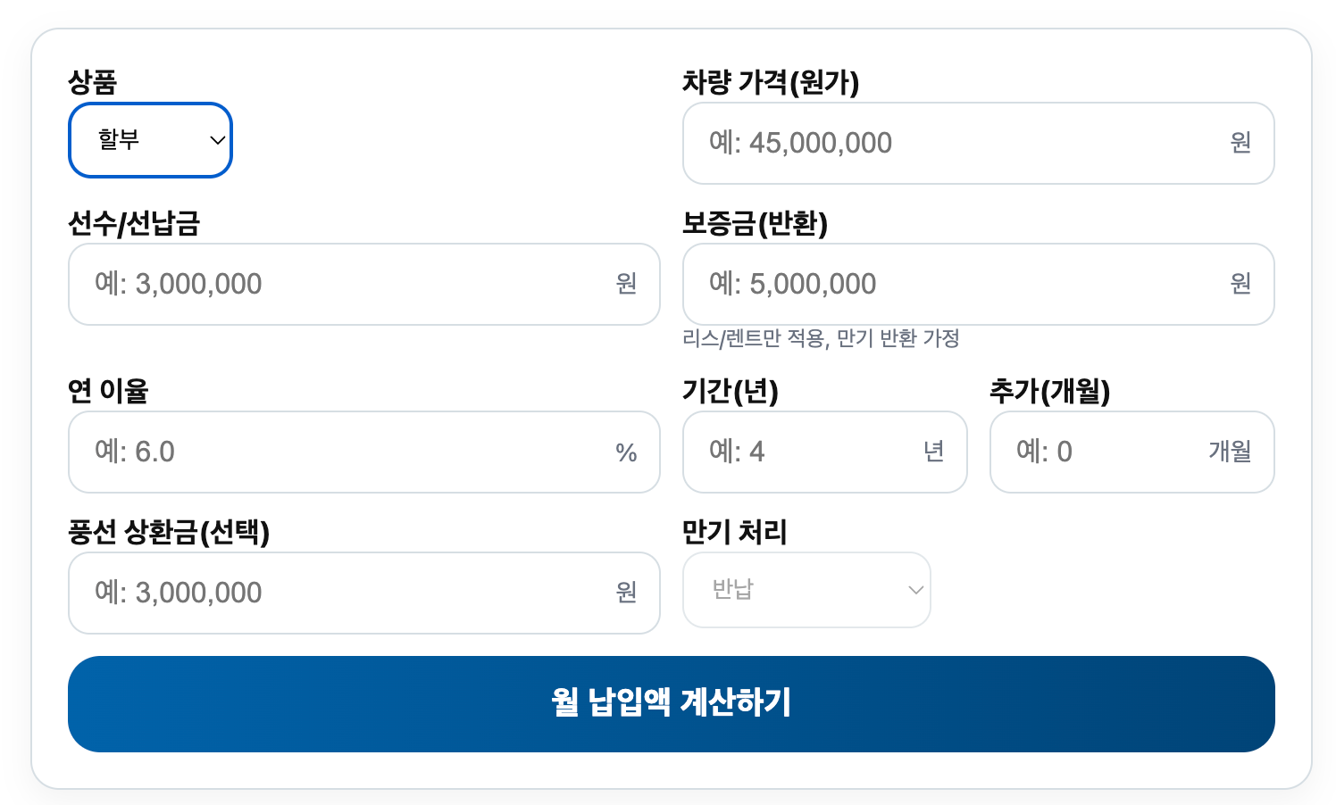 • 풍선 상환금(선택, 할부용): 만기에 일시 상환할 금액(=잔금; 월 납입액↓)