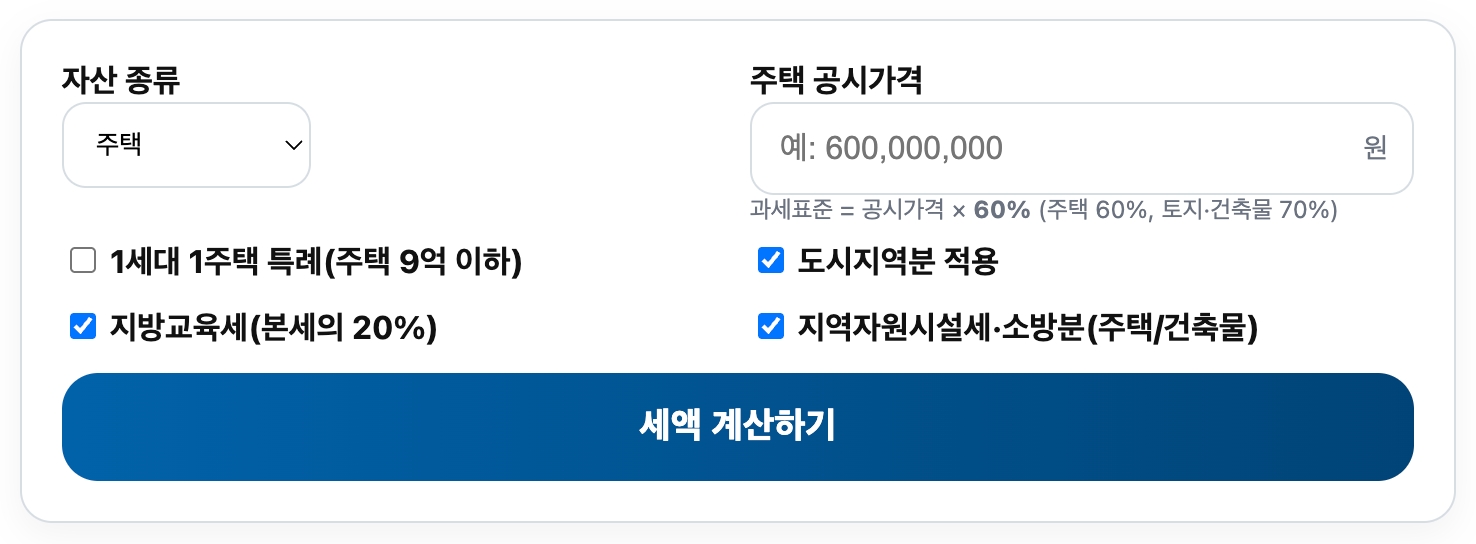 - 예: 주택 공시가격 6억 원 → 과세표준 = 6억 × 60% = 3억 6천만 원