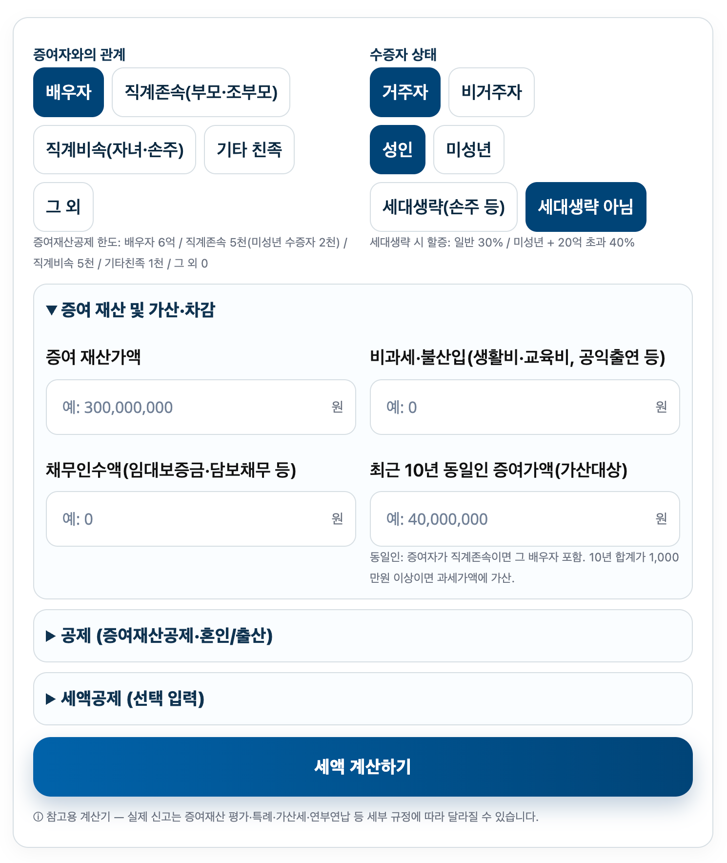 - [세액 계산하기] 클릭 → 과세가액, 과세표준, 산출세액(누진공제), 세대생략 할증, 지방세까지 최종 예상 세액을 한 번에 확인
